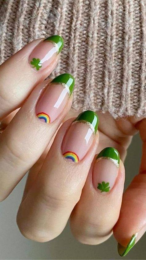 Classic green French tips with gold glitter outlines are paired with delicate shamrocks and tiny rainbow accents on a nude base. The look feels sweet, festive, and perfectly themed for a cheerful St. Patrick’s Day style.