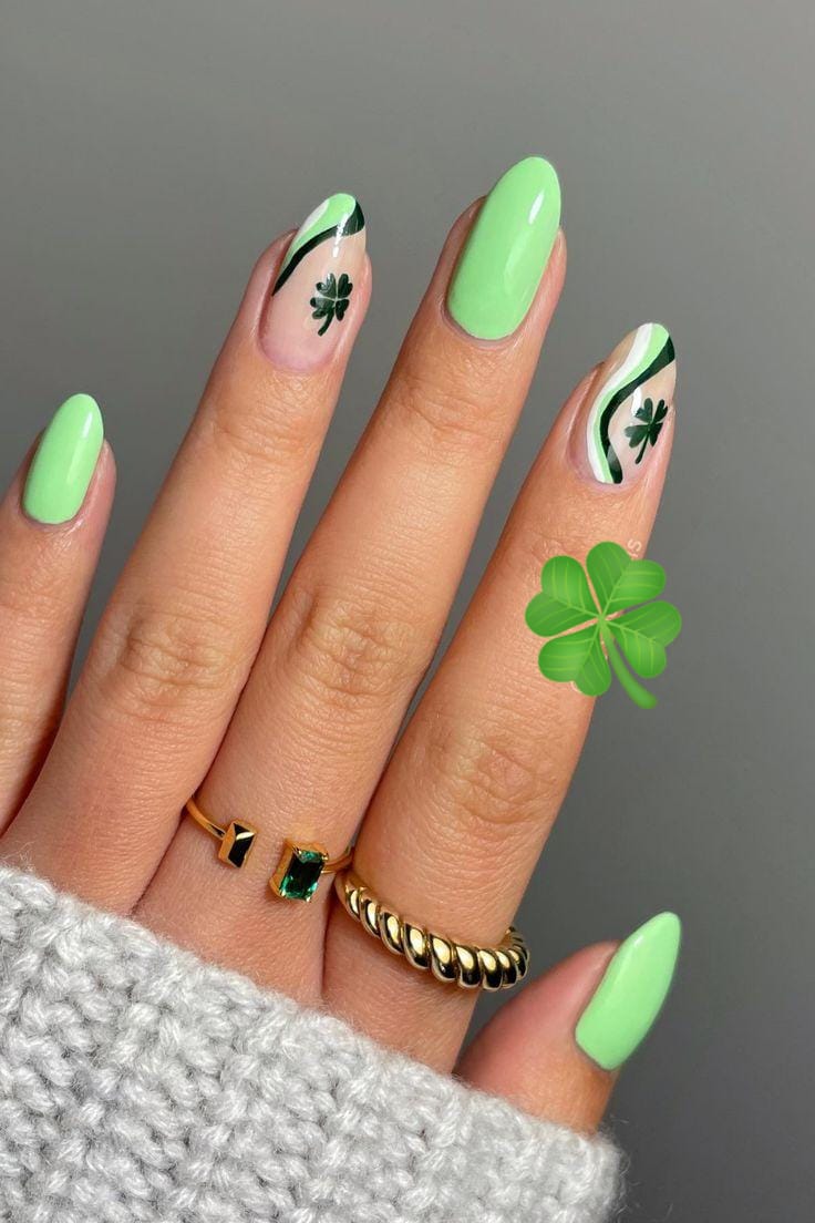 This design combines solid glossy green nails with nude accents featuring bold shamrocks and swirling green lines. The look feels trendy, eye-catching, and stylishly festive without being over the top.