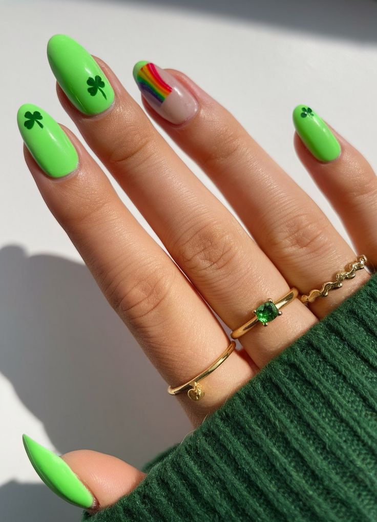 Bold neon green nails are accented with small black shamrocks and a simple rainbow detail. The overall look is bright, cheerful, and perfect for making a fun statement.