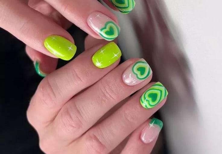 These short nails mix bright lime green with sheer nude bases and layered green heart designs for a fun, eye-catching look. The glossy finish and vibrant tones give it a fresh, youthful St. Patrick’s Day vibe.