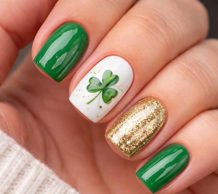 This design mixes glossy green nails with a white accent nail featuring a soft shamrock detail and subtle gold specks. The gold glitter nail adds a rich, festive sparkle that feels bold yet balanced.
