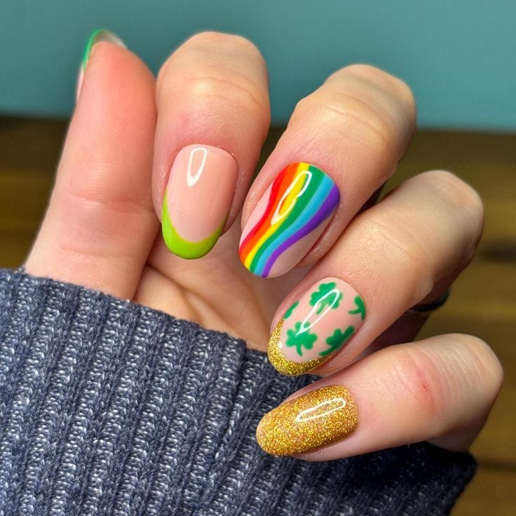 This playful design blends bright green French tips, a bold rainbow accent nail, shamrock details, and a sparkling gold nail. It feels fun, colorful, and full of festive St. Patrick’s Day energy.