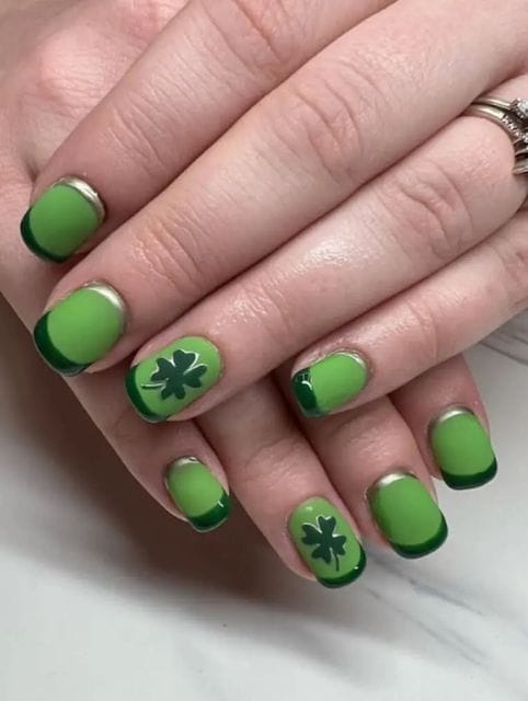 This look features soft green nails with darker green French tips and simple shamrock accents. The glossy finish and layered greens create a clean, modern, and subtly festive vibe.