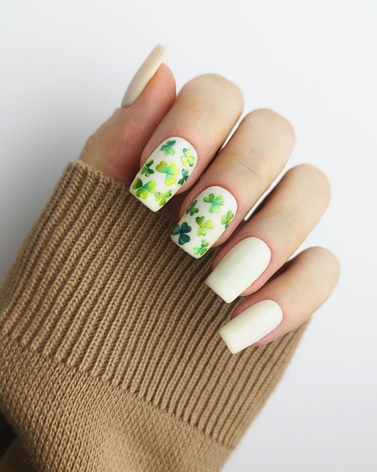 This creamy white manicure is decorated with scattered green shamrocks in different shades for a playful touch. It gives off a light, cheerful, and slightly whimsical St. Patrick’s Day vibe.