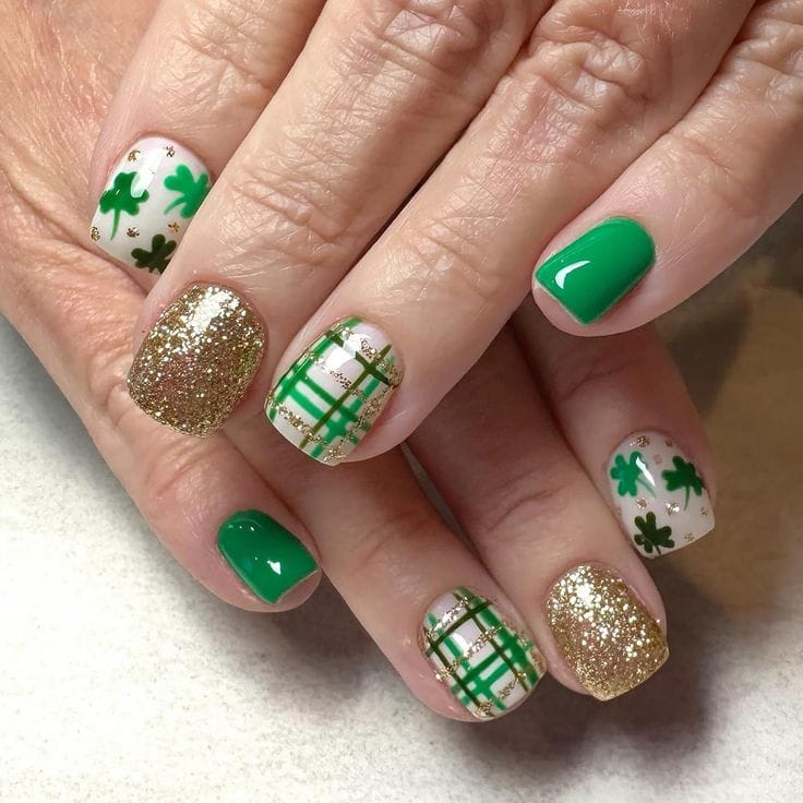 This short square design mixes bold emerald nails with glittery gold accents and playful shamrock art. The plaid pattern and sparkle give it a fun, cheerful, and celebratory holiday feel.