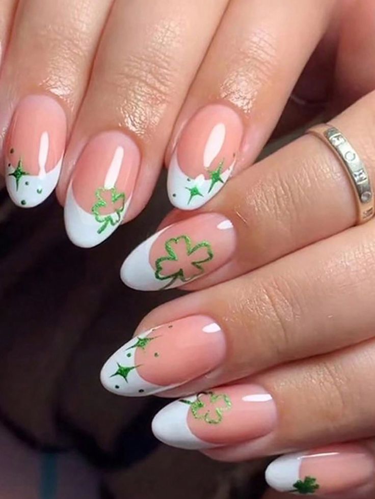 This short almond set features a soft nude base with crisp white French tips and delicate green shamrock outlines. Subtle sparkle accents add a light, elegant touch while keeping the look festive and fresh.