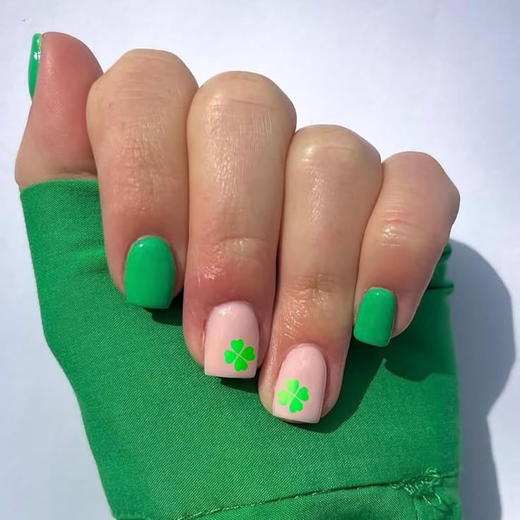 This short square design combines solid bright green nails with soft pink accents and simple clover art. The overall vibe is clean, bold, and perfect for a fun yet easy St. Patrick’s Day look.