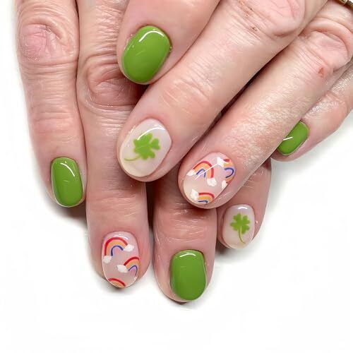 This short nail set mixes glossy shamrock green with soft nude accent nails featuring clovers and tiny rainbows. It has a playful, festive vibe that feels perfect for St. Patrick’s Day without being over the top.