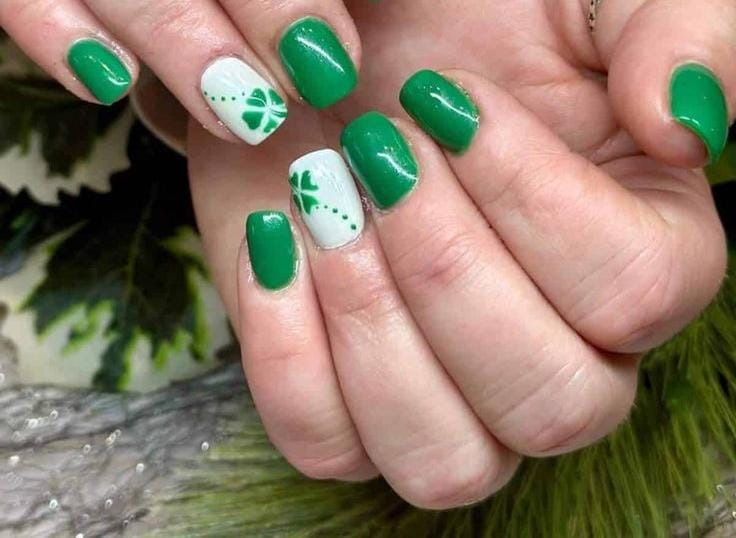 Rich green polish is balanced with crisp white accent nails showcasing small shamrock details and dotted designs. It feels bold yet traditional, capturing that timeless St. Patrick’s Day spirit.