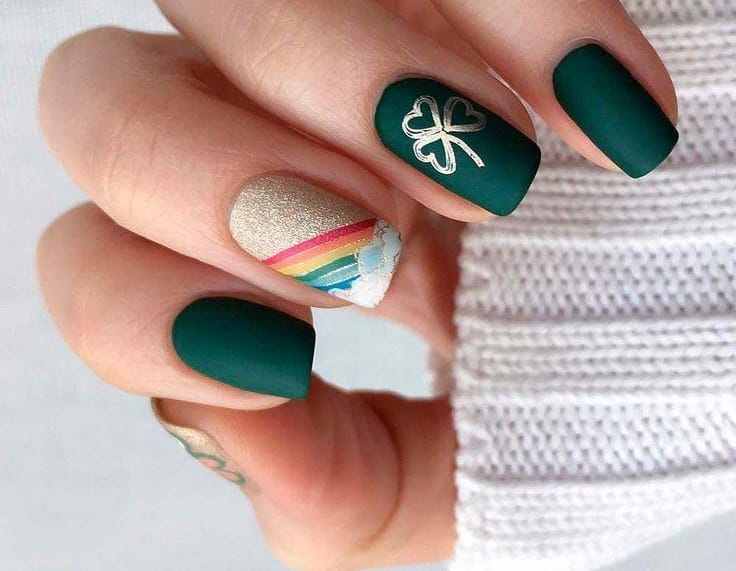 These short matte nails combine deep emerald green with a delicate shamrock accent and a glittery rainbow detail on a gold base. The design feels cozy and whimsical, blending classic St. Patrick’s Day symbols with a playful twist.