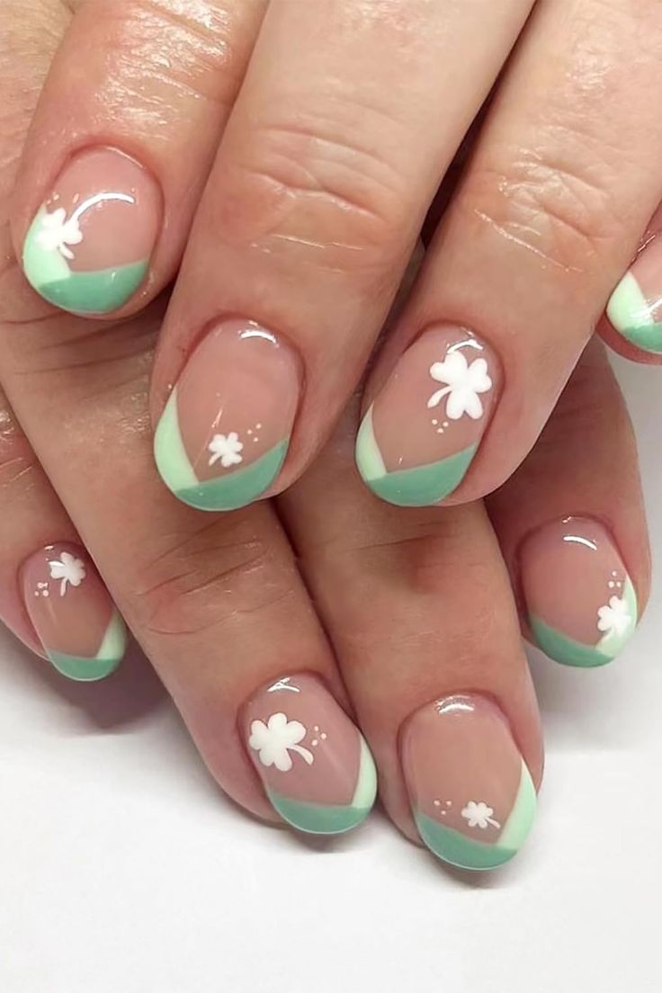 Soft mint French tips are layered over a natural base with delicate white clover accents. The design is light, subtle, and feminine, offering a chic and understated holiday touch.