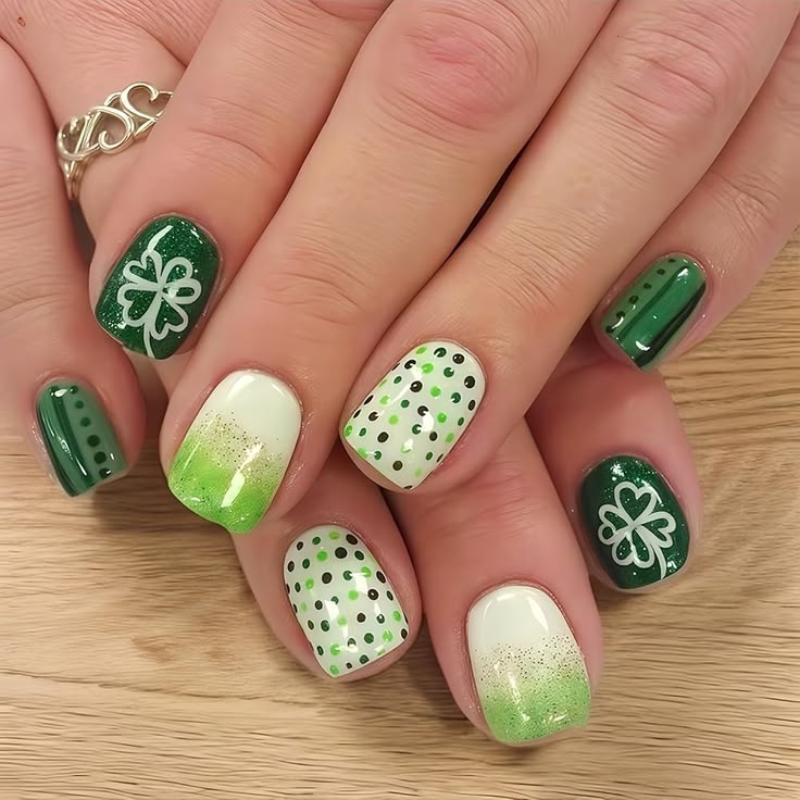 This short nail design features a fresh mix of deep green, white, and soft gradient lime tones. Polka dots and simple shamrock accents give it a playful, festive St. Patrick’s Day vibe with a touch of sparkle.