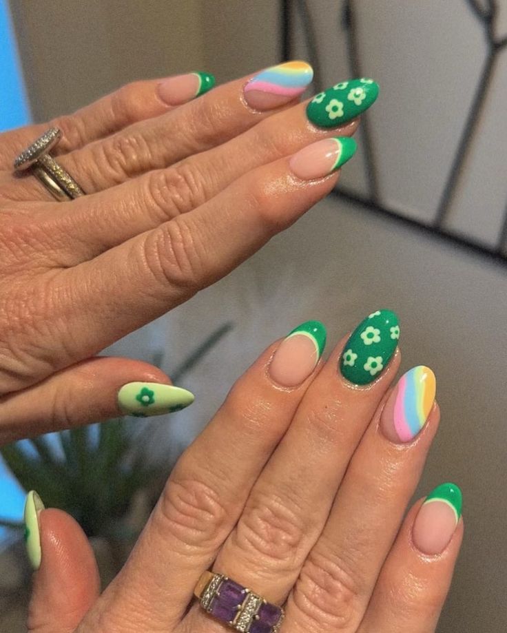These short almond nails blend bright green French tips with soft pastel rainbow waves and tiny floral accents. The look feels fun, cheerful, and modern while still keeping that lucky St. Patrick’s Day charm.