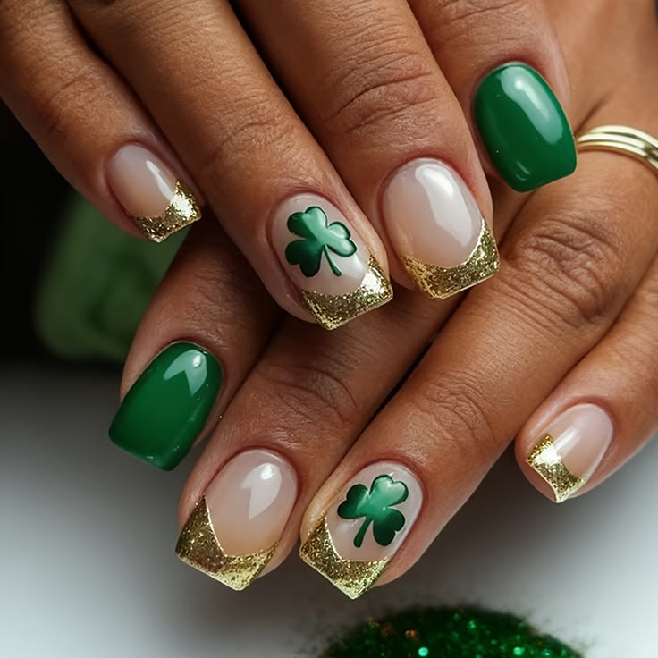 These short square nails combine rich green polish with nude bases and sparkling gold French tips. Bold shamrock accents add a classic St. Patrick’s Day charm while keeping the overall look chic and polished.