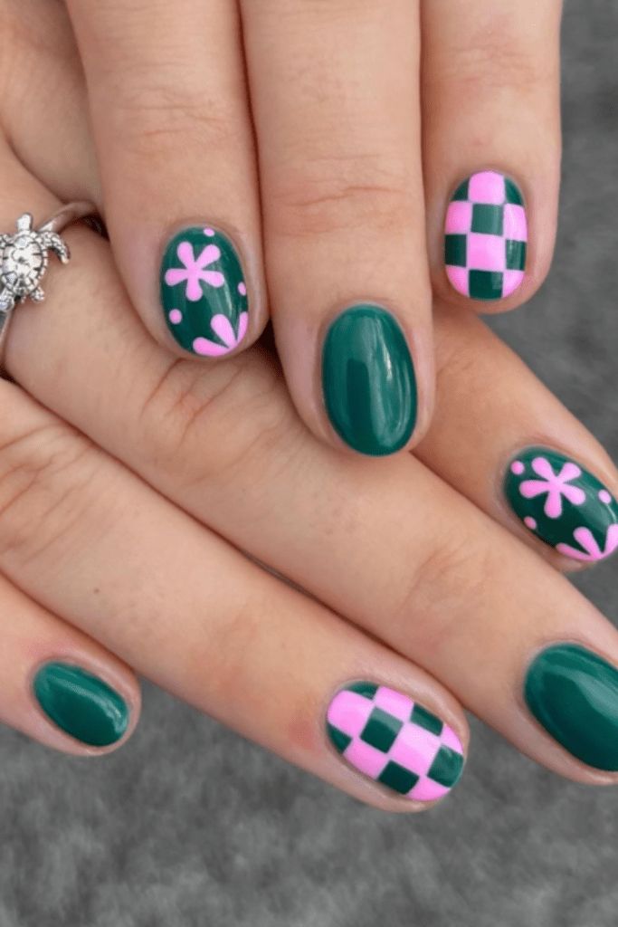 This short nail design blends deep green polish with bold pink floral accents and a playful checkerboard pattern. The contrast creates a fun, trendy St. Patrick’s Day look with a modern, retro twist.