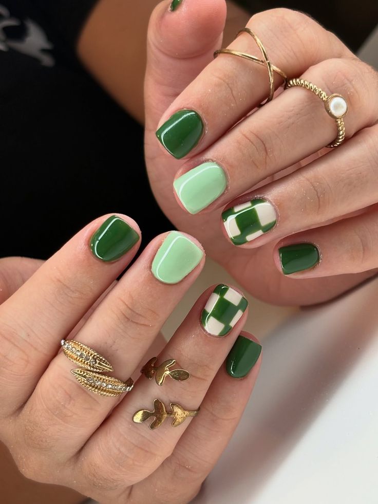 This design combines rich green and soft mint shades with a trendy checkerboard accent nail. It feels modern, stylish, and subtly festive without being over the top.