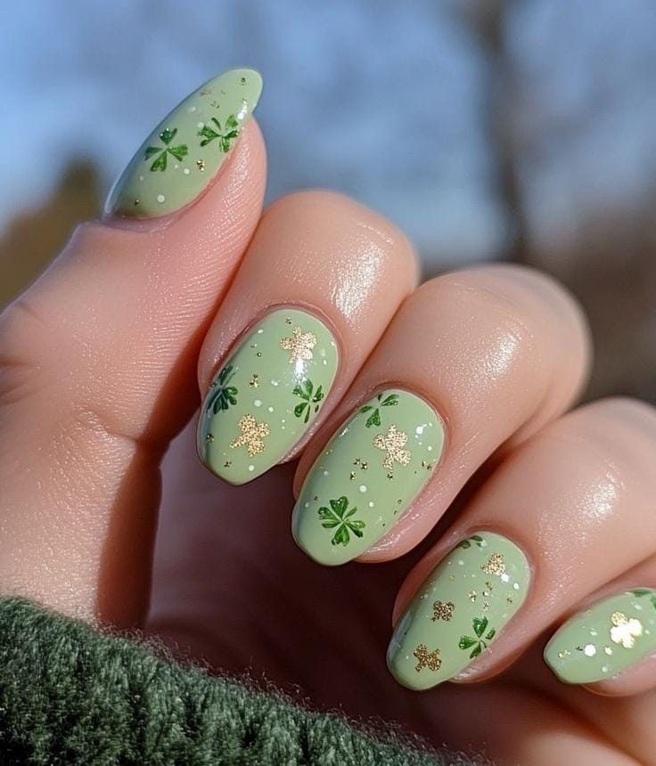 Soft Sage Gold Shamrock Nails