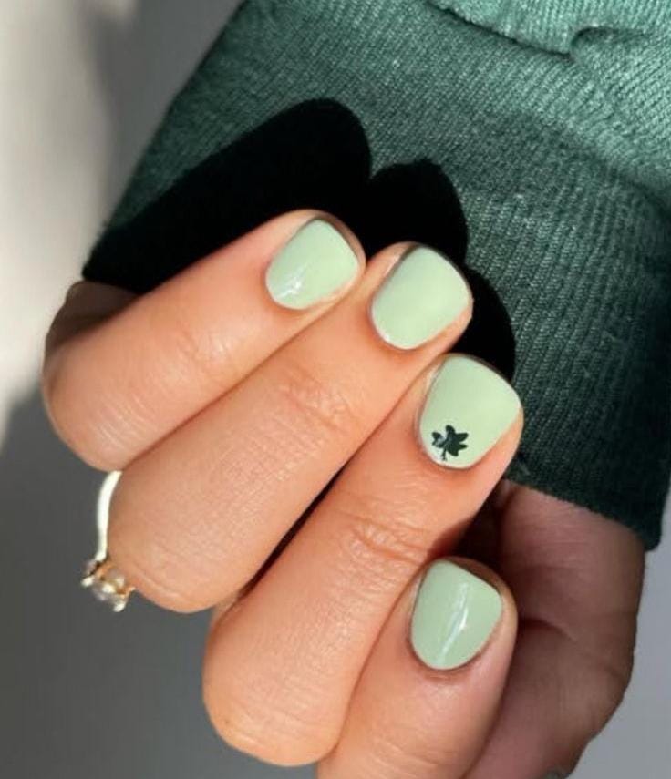 A soft mint green manicure with a glossy finish and a tiny dark shamrock accent for a subtle festive touch. It’s simple, fresh, and perfect for a minimal St. Patrick’s Day look on short nails.