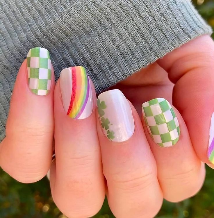 This playful design combines green and white checkerboard patterns with a bright rainbow accent and delicate shamrock details. The mix of patterns gives it a fun, cheerful vibe that feels bold yet balanced on short nails.
