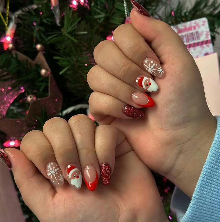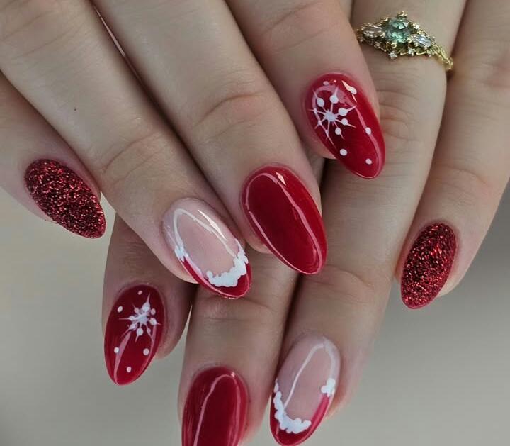 Shiny red nails are paired with subtle white snowflakes and santa hat tips. The mix of glossy red and deep red glitter gives a timeless holiday elegance.
