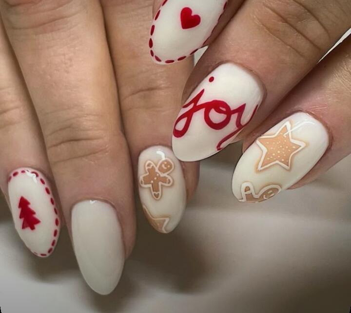 Warm white nails are decorated with gingerbread-style motifs—stars, cookies, stitched edges, and festive lettering. The overall look is cute and nostalgic, capturing the cozy sweetness of holiday baking.