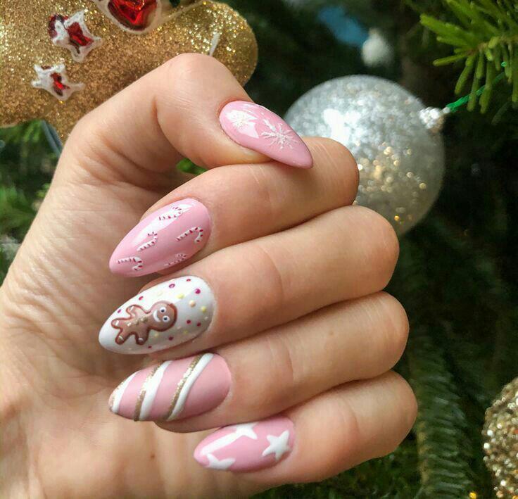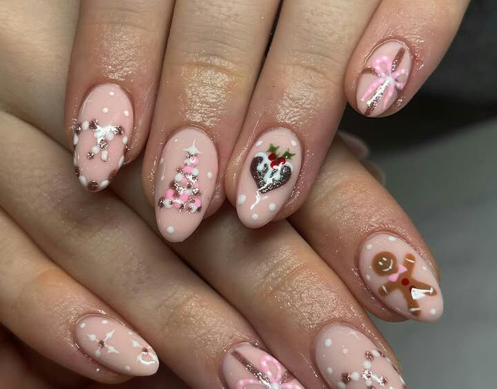 This design features soft pink almond nails decorated with cute holiday accents like bows, gingerbread men, stars, and a tiny Christmas tree. The look is playful and festive, with a cozy, whimsical vibe perfect for the season.