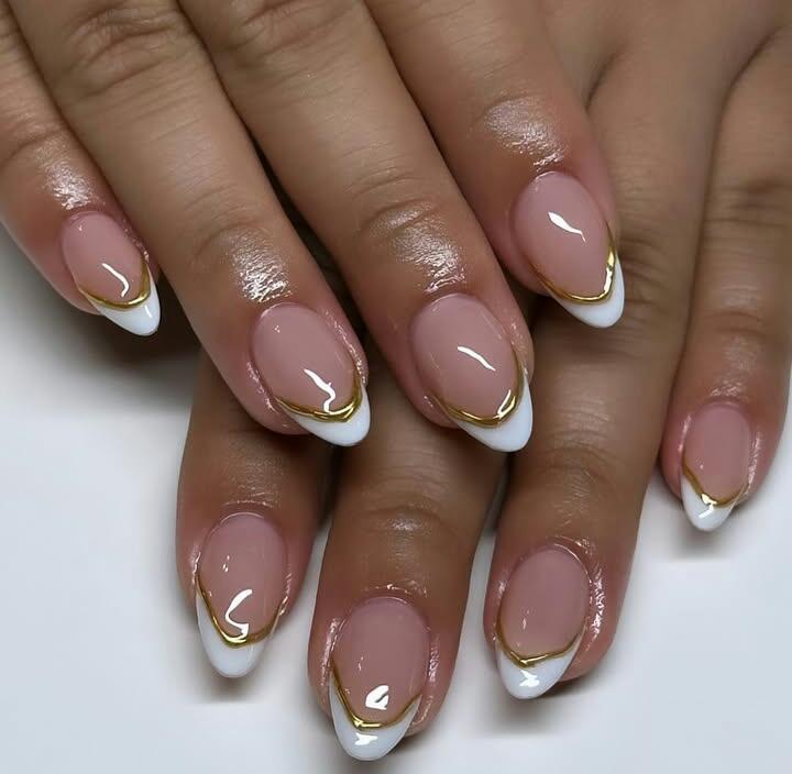 These nails showcase a modern French tip with crisp white edges outlined in elegant gold. The glossy nude base keeps it classy and minimal, giving the whole look a polished holiday sophistication.