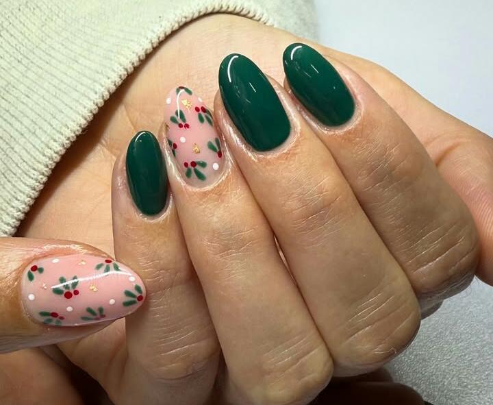 A deep forest green pairs beautifully with soft pink accent nails covered in holly and berry patterns. The mix feels warm, festive, and slightly rustic, perfect for a subtle Christmas mood.