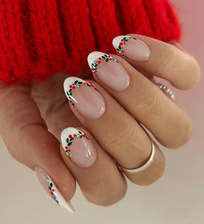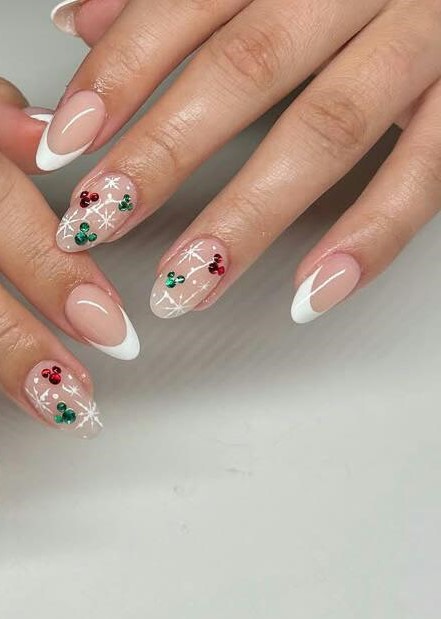 A soft natural base is topped with delicate white French tips and scattered red and green berry accents and snowflakes. The design feels fresh, wintry, and light, giving a gentle Christmas sparkle without being too bold.