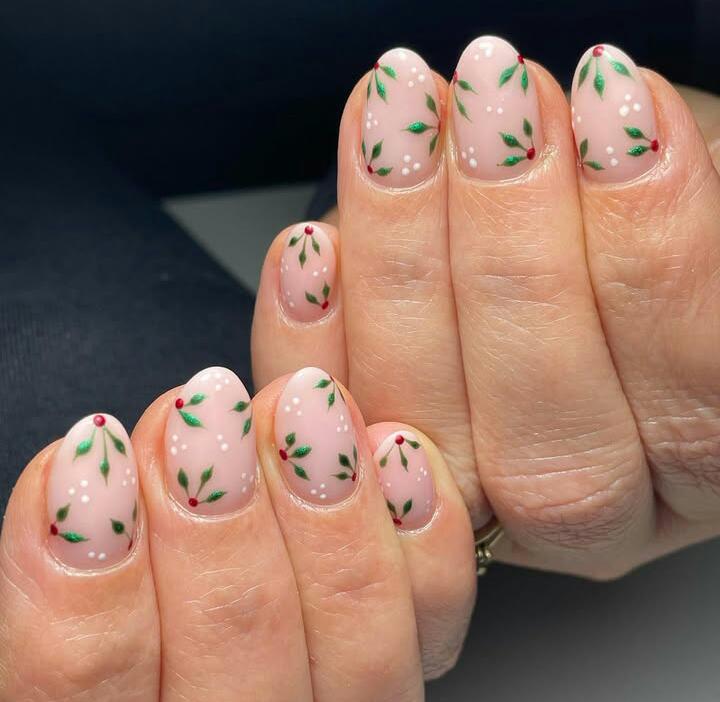 These short almond nails have a sheer pink base covered with small scattered holly leaves and subtle white snow-dot accents. The look is dainty, light, and perfect for a minimalist holiday vibe.