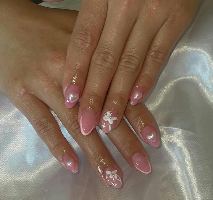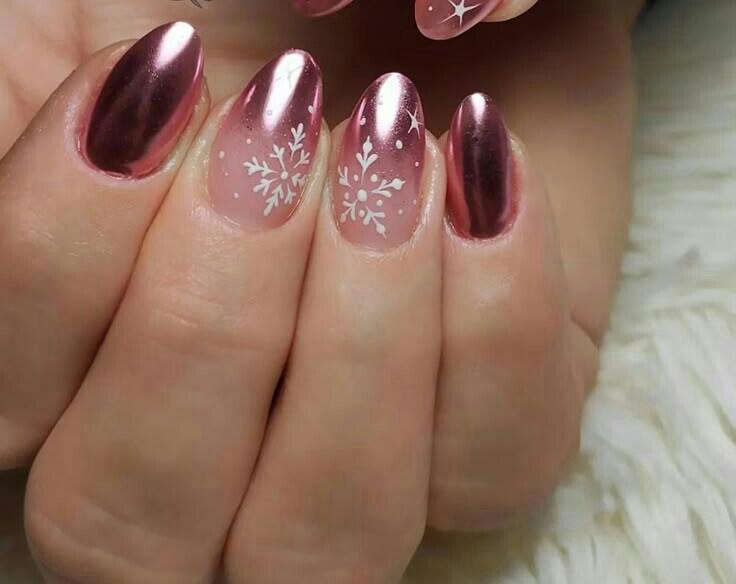 These nails stand out with a shiny rose-chrome finish paired with soft, frosty snowflake accents. The combination feels both glamorous and wintery, perfect for a polished holiday look.