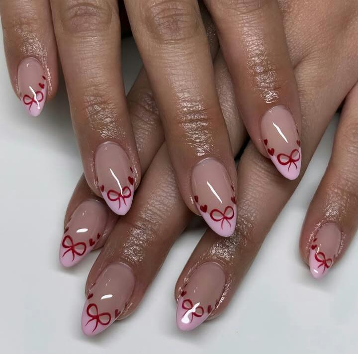 A blushing nude base pairs with thin pink French tips, each accented with tiny red bows and hearts. The style is playful and festive while still looking polished.