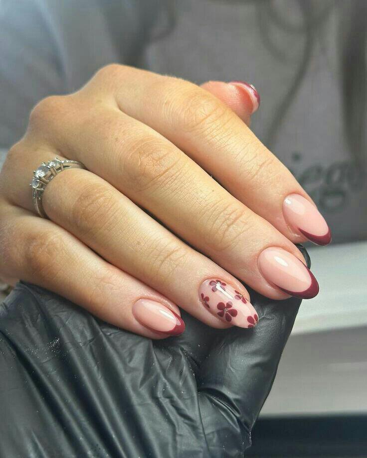 These almond nails mix a soft nude base with deep burgundy French tips and one accent nail decorated in matching floral designs. It gives a cozy winter feel with a slightly more sophisticated, warm color palette.