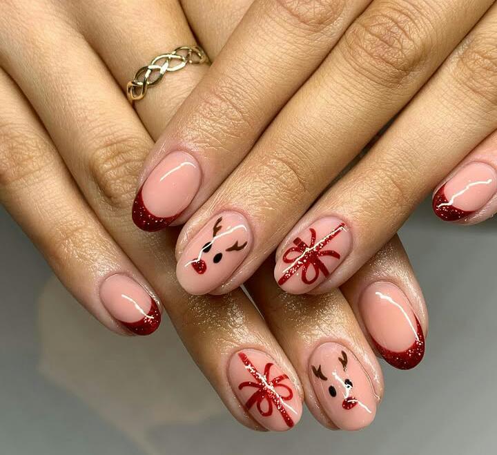 This design pairs a soft nude base with festive red French tips, creating a cute holiday look. The tiny reindeer faces and gift-bow accents add a playful Christmas touch without feeling too busy.