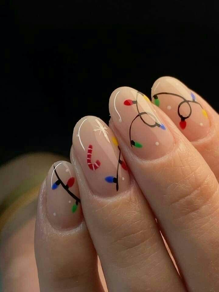 These short almond nails feature a sheer nude background decorated with colorful string-light illustrations. The look is fun, whimsical, and perfect for anyone who wants a subtle but festive Christmas vibe.