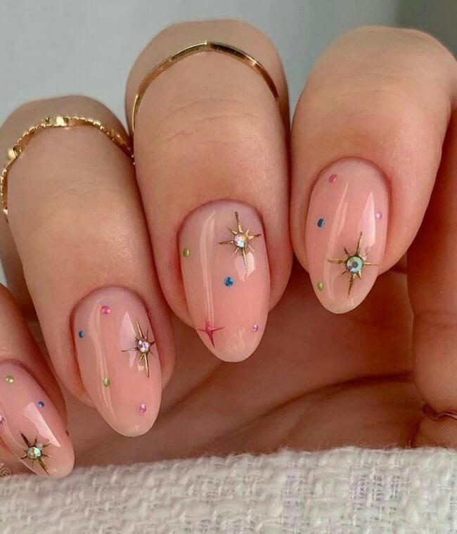 A glossy nude base is sprinkled with tiny pastel dots and accented with delicate gold starbursts. The result is soft, sparkly, and elegant with a magical holiday feel.