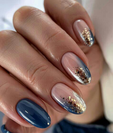 Soft nude ombre nails are paired with deep blue accents and shimmering gold foil gradients. The combination feels wintery and sophisticated, giving off a cozy–glam holiday energy.