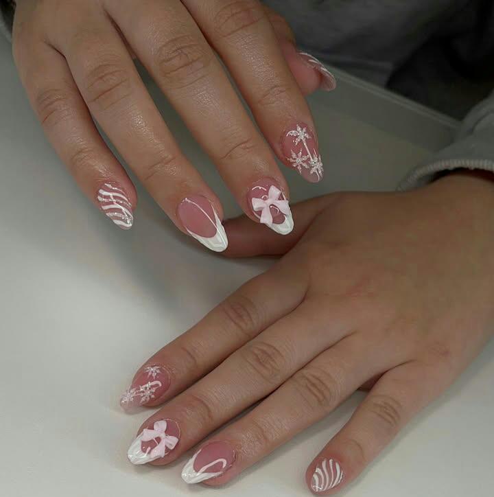 This set features soft pink almond nails decorated with white bows, snowflakes, and delicate winter patterns. The look feels sweet, feminine, and perfect for anyone wanting a cozy holiday vibe with a touch of elegance.