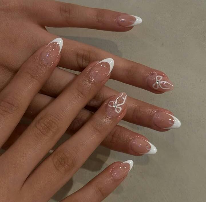 These nails combine clean white French tips with subtle shimmer and simple white bow accents. The style is minimal yet festive, giving a polished Christmas feel without being overly detailed.