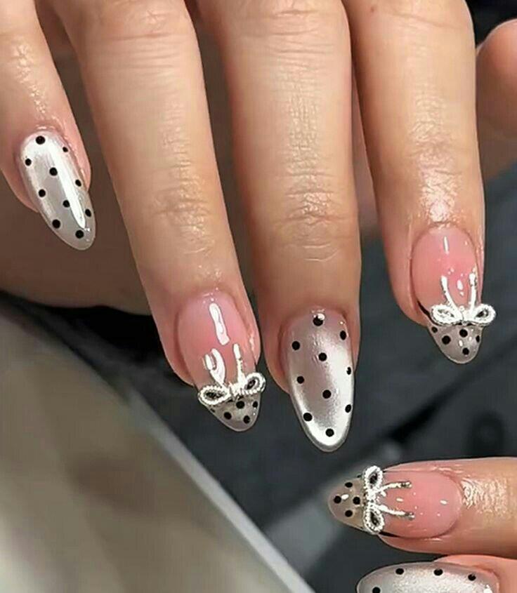 This design mixes pink and pearly white nails with playful black polka dots and tiny white bow art. It has a cute, vintage-meets-holiday aesthetic that stands out while still feeling soft and wintry.