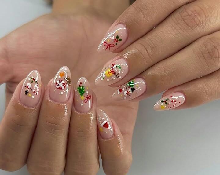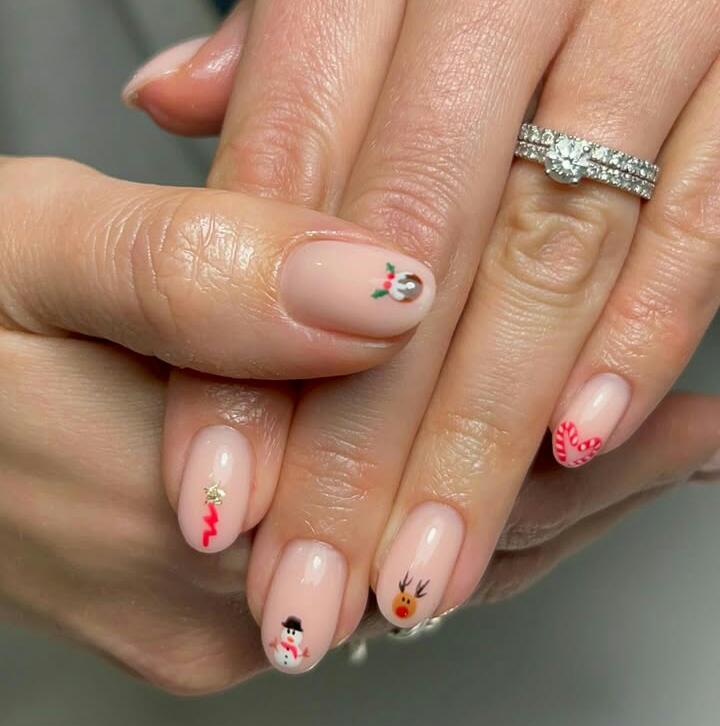 This short almond set features tiny holiday illustrations like a snowman, reindeer, candy cane, and holly on a nude base. The overall look is adorable and lighthearted, perfect for a fun and cheerful Christmas manicure.