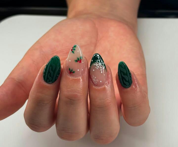This design mixes deep forest-green nails with cozy sweater-texture accents and soft nude nails decorated with tiny holly berries and white snowflakes. It feels festive, classic, and warm — perfect for a subtle Christmas vibe.