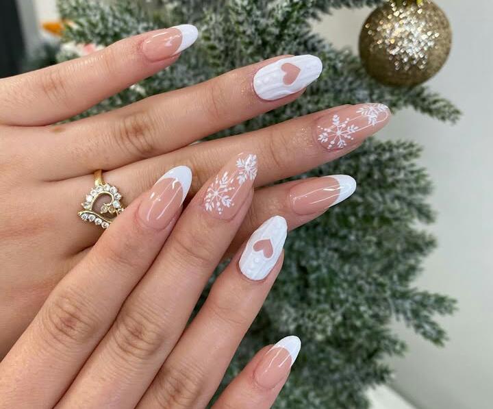 Soft white French tips are paired with delicate snowflakes and cute heart accents for a sweet winter look. The design is crisp, clean, and romantic, giving a soft holiday feel without being overly bold.