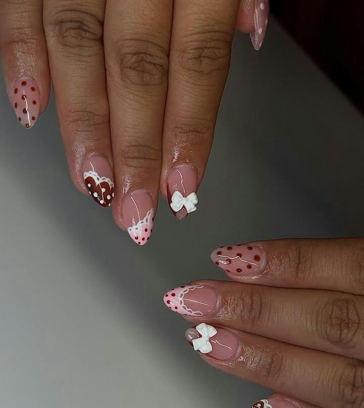 This set blends warm brown and pink tones with dotted patterns and lace-style swirls, topped with 3D white bows. It has a cute, candy-inspired Christmas aesthetic that feels playful and girly.