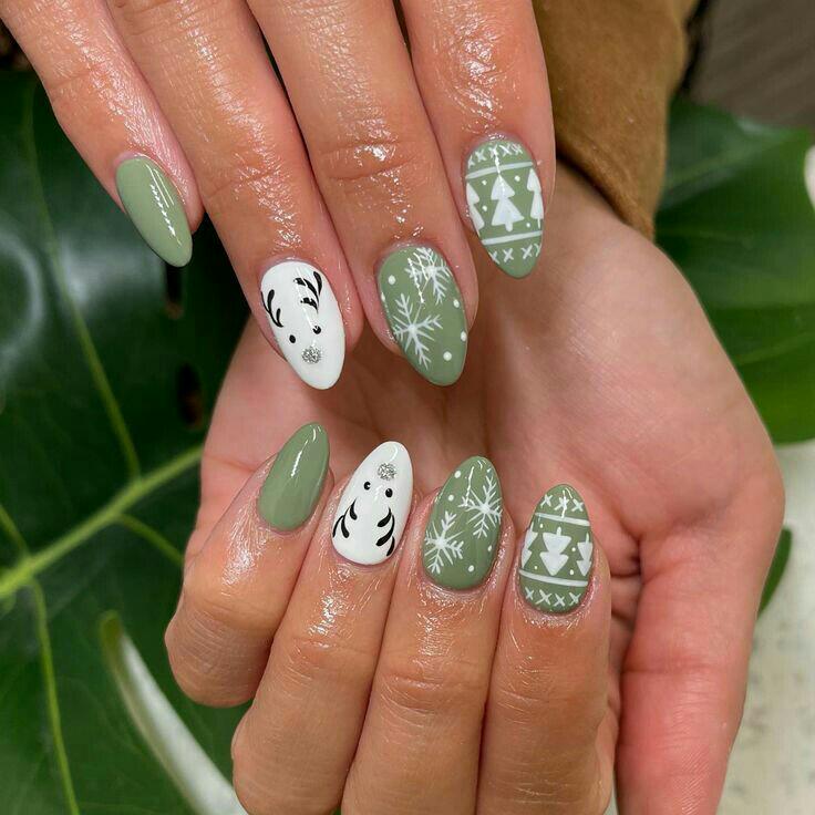Soft sage green and white nails feature snowflakes, sweater-print patterns, and adorable minimalist reindeer faces. It’s cozy, trendy, and perfect for anyone wanting a modern Christmas nail look.