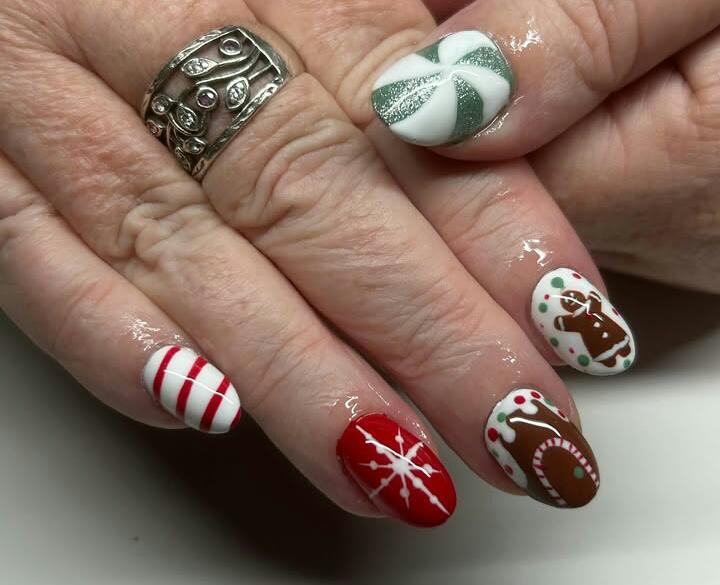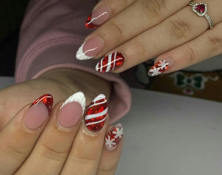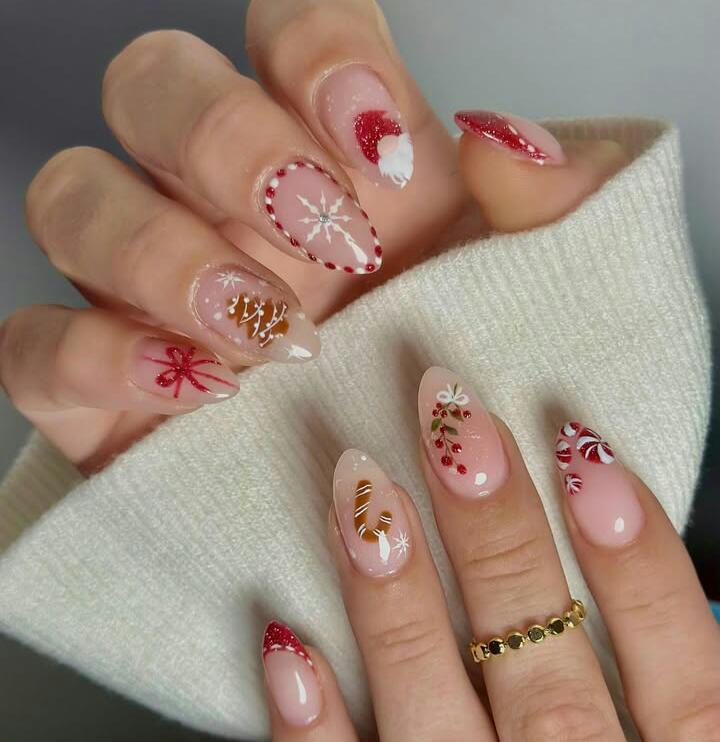 These nails mix warm red accents with sweet Christmas motifs such as gingerbread details, berries, snowflakes, and candy canes. The look feels cozy and festive, perfect for anyone who wants a mix of classic red and playful holiday art.