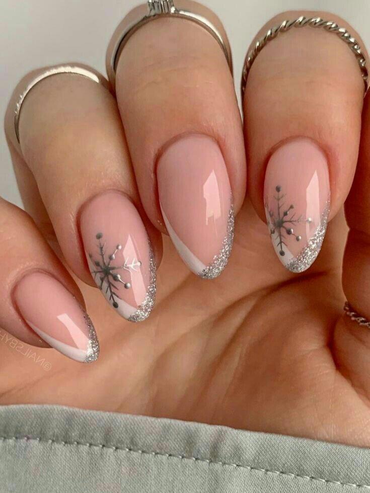 This set keeps things elegant with a soft pink base and delicate white-silver-tipped French edges. Subtle snowflake designs add a wintery, refined touch that feels both festive and minimalistic.
