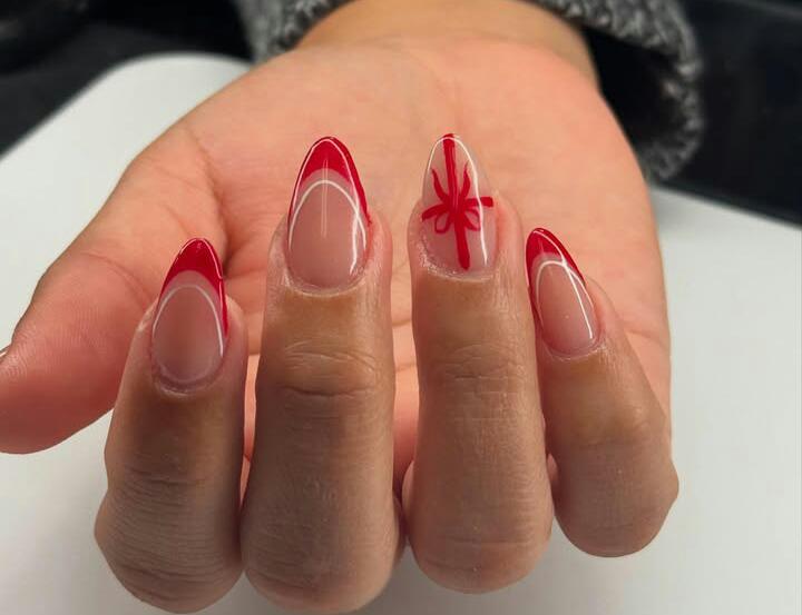 These nails feature clean red outline French tips paired with a standout ribbon design on one nail. The look is modern and crisp, giving Christmas vibes in a minimal yet eye-catching way.