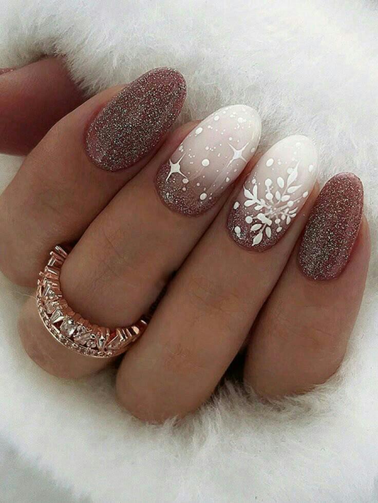 Soft glittery rose tones pair beautifully with white, frosty snowflake art for a dreamy winter feel. The design is delicate and feminine, with a smooth gradient effect that makes it look soft and magical.