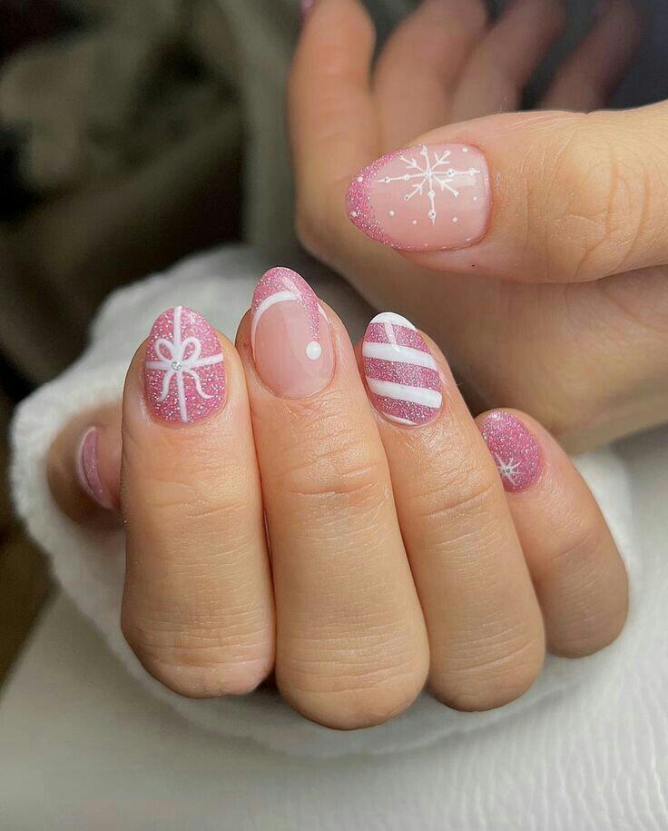 Glittery pink nails paired with clean white stripes, bows, and snowflakes create a cute and girly holiday look. The blend of sparkles and soft blush tones gives it a sweet, gift-wrapped aesthetic.